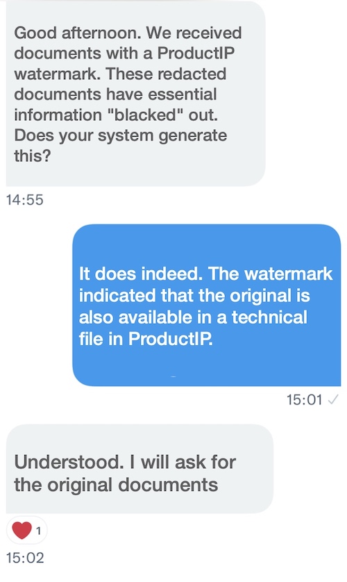 Someone from a market surveillance authority received so-called redacted documents with a ProductIP watermark and wondered if they were genuine. We confirmed that the ProductIP document viewer has a built-in redaction function. It enables our users to blacken (or whiten) information on documents that they don’t want to disclose when sharing information in the supply chain.