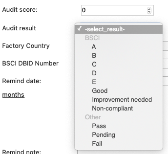 Track the score on social compliance audits of your suppliers. Select “social compliance” as document category in the edit metadate window. Two fields will become visible. Audit score and Audit result.